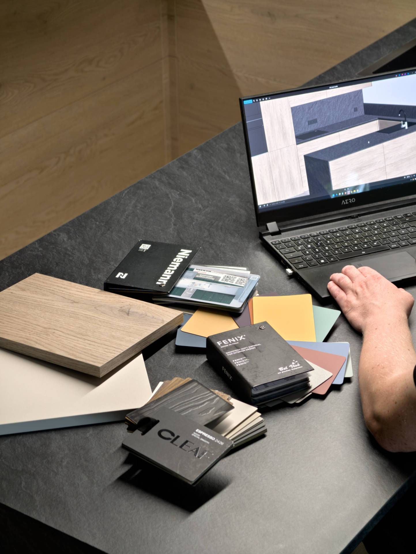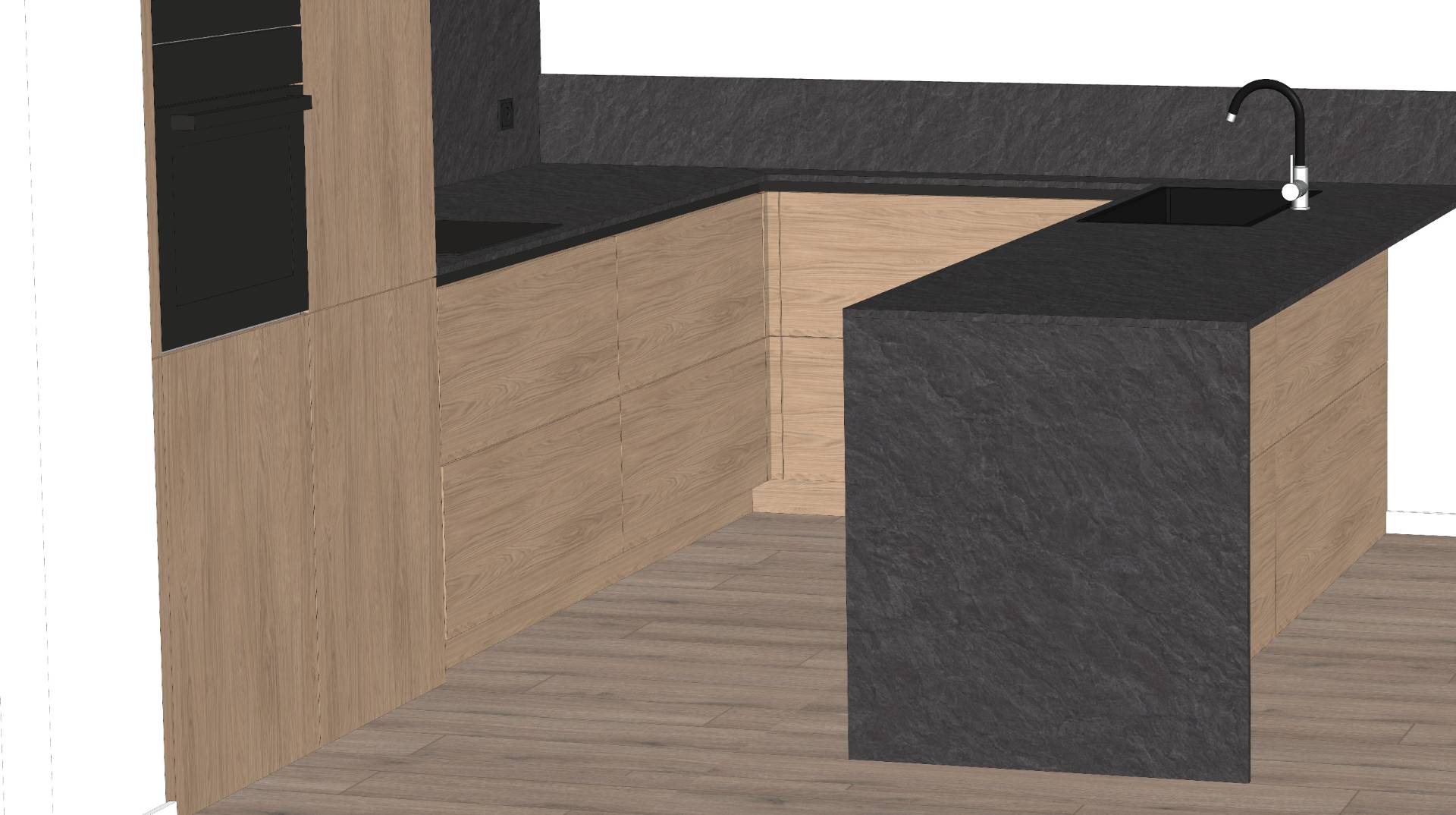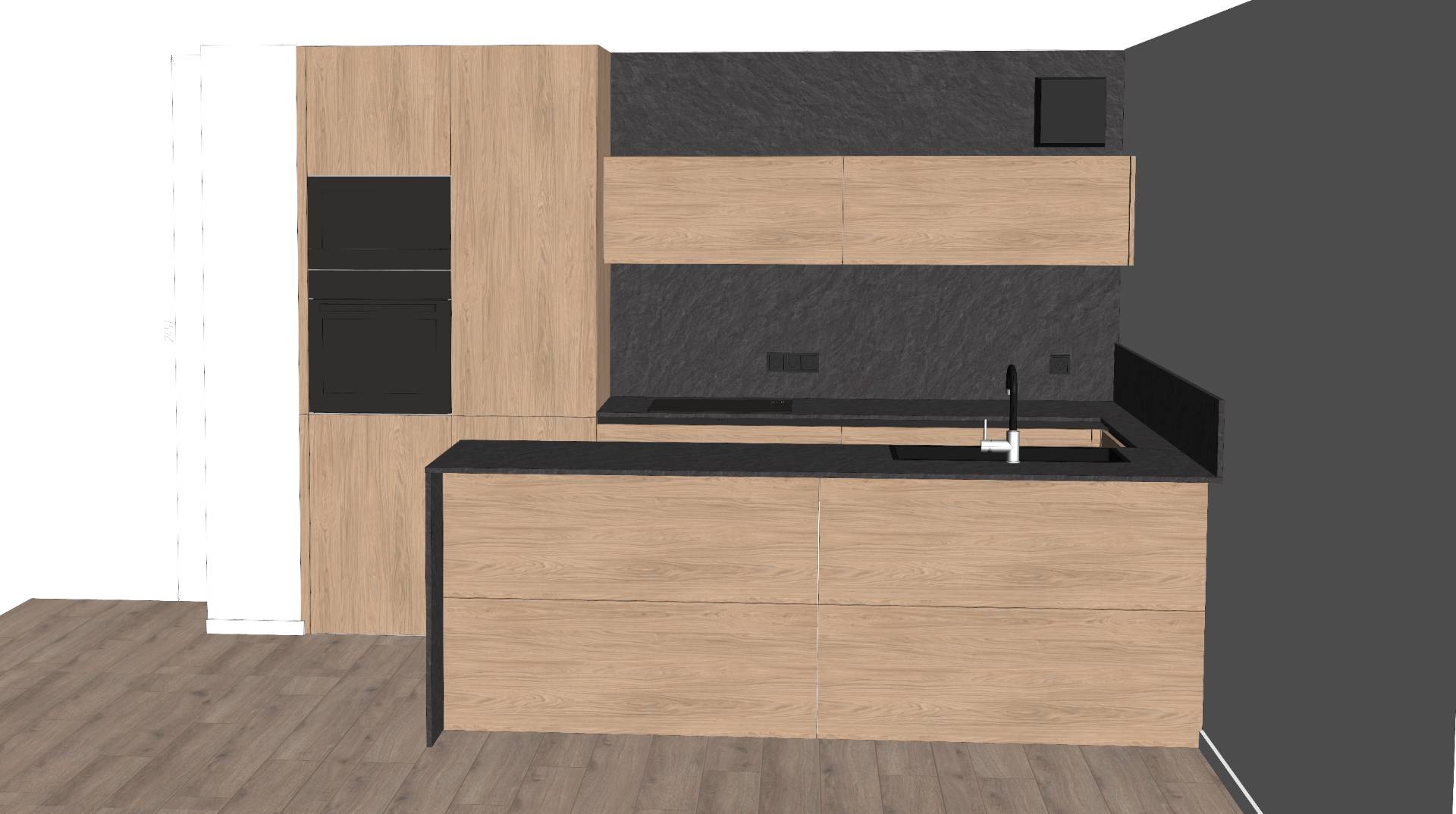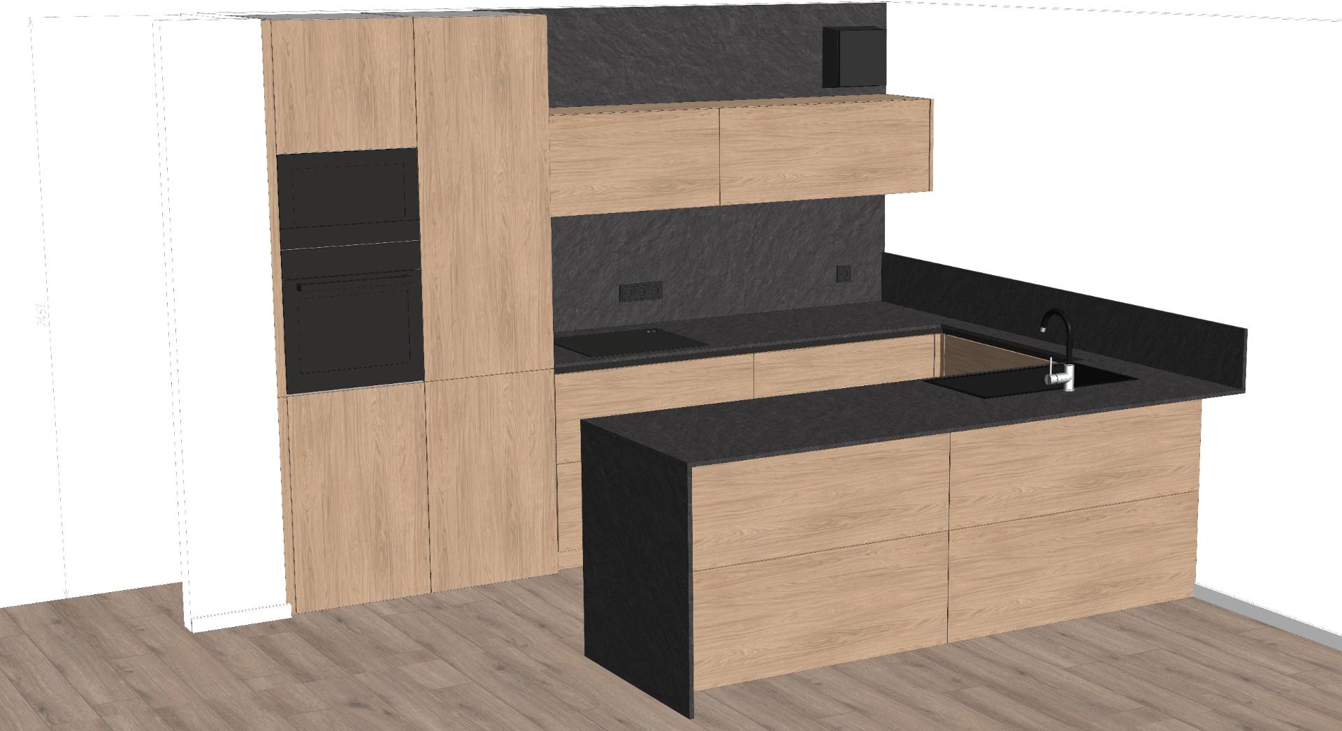 В этом проекте мы воплотили концепцию современного минимализма, уделяя внимание каждой детали. Основа кухни — выразительные фасады под дерево, которые гармонично контрастируют с глубоким черным камнем столешницы и фартука.